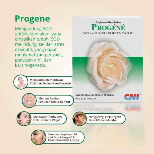Belanja SekarangProgene mengandung SOD yaitu antioksidan alami yang dihasilkan oleh tubuh. SOD berperan penting dalam melindungi sel terhadap stres oksidatif, yang dapat menyebabkan terjadinya beberapa penyakit dan proses degenerasi seperti penuaan dini dan karsinogenesis.