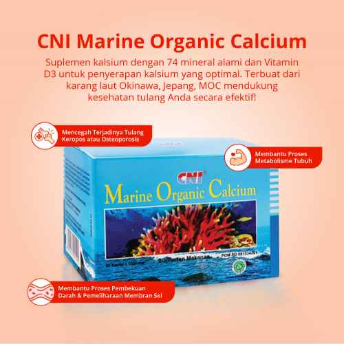 Belanja SekarangCNI Marine Organic Calcium (MOC) adalah suplemen Kalsium dengan kandungan 74 unsur mineral alami yang dibutuhkan tulang. MOC diperkaya Vitamin D3 yang meningkatkan penyerapan kalsium ke dalam tulang. Bahan dasar MOC adalah coral calcium yang secara alami didapatkan dari karang laut di perairan Okinawa, Jepang.