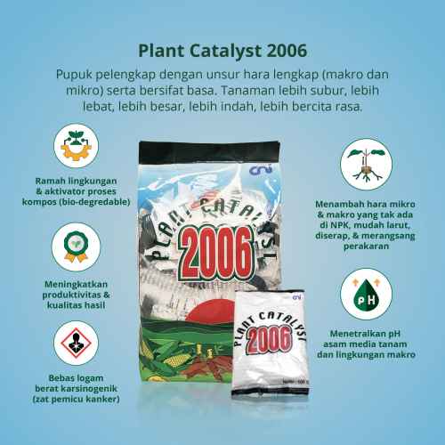 Belanja SekarangPlant Catalyst 2006 adalah pupuk pelengkap dengan unsur hara lengkap (makro dan mikro) serta bersifat basa. Tanaman lebih subur, lebih lebat, lebih besar, lebih indah, lebih bercita rasa dengan Plant Catalyst 2006.