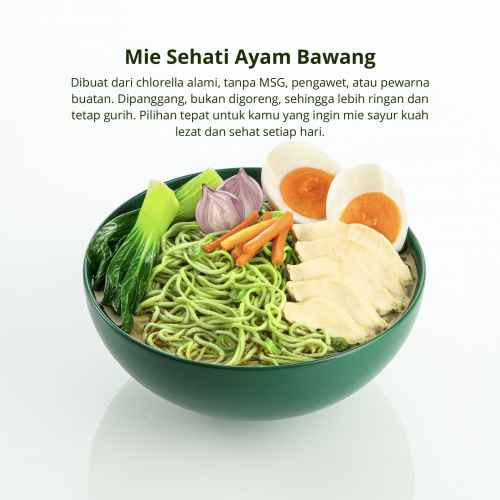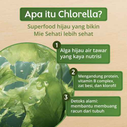 The 1st Healthy Noodle with Chlorella, si superfood yang kaya akan Vitamin B12 untuk bantu jaga energi, metabolisme, dan kesehatan tubuh. Mie Sehati bukan cuma mie sayur biasa. Ini adalah mie sehat yang rasanya enak, karena dibuat tanpa MSG, dipanggang (bukan digoreng minyak), serta pastinya HALAL dan lulus BPOM. Jadi, cocok buat sarapan, ngemil, sampai snack tengah malam